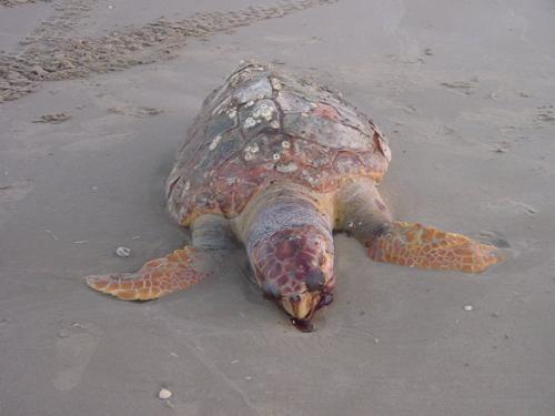 Matamoros, Tamaulipas.-Una tortuga enorme fue localizada muerta y en estado de descomposición en Playa Bagdad aproximadamente dos kilómetros al lado sur este fin de semana pasado.